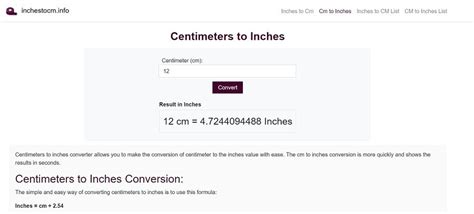 • Online Converters: There are tons of online tools where you can type in your inch value, and it instantly converts it to centimeters. Just search for ‘inch to cm converter’ – you’ll find plenty!