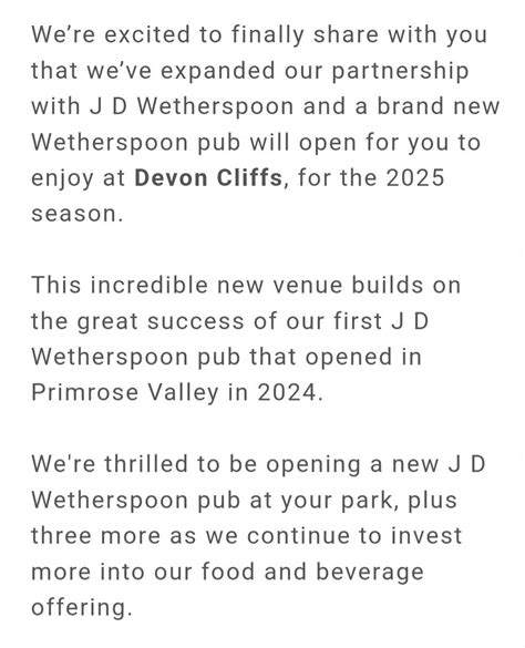 Hey there, holidaymakers and pub grub fans! Gather ‘round, because we’ve got some super exciting news that’s going to make your next trip to Haven Devon Cliffs even better. You’ve been asking, you’ve been wondering, and now we can finally spill the beans: the Wetherspoons at Devon Cliffs is officially opening its doors! Get ready to raise a pint and tuck into some classic pub fare because this is the news you’ve been waiting for. We know how much a reliable Wetherspoons can add to a holiday, offering familiar comfort food, a great selection of drinks, and of course, those famously affordable prices. Whether you’re looking for a hearty breakfast to kickstart your day of adventures, a relaxing lunch after a dip in the pool, or a lively spot for an evening meal with the family, this new addition is set to become a real hub for guests. The anticipation has been building, and it’s fantastic to finally confirm the opening date, ensuring you can plan your visit accordingly. We’re talking about more than just a place to eat and drink; it’s about creating memories, sharing laughs, and enjoying the simple pleasure of a good old British pub right on your doorstep. So, bookmark this page, tell your mates, and get ready to experience the Wetherspoons magic at Devon Cliffs – it’s going to be epic!