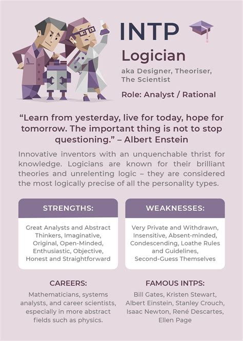 Finally, their independence and self-reliance are noteworthy. INTPs are often comfortable working alone and are not easily influenced by external pressures or the need for social validation. They trust their own judgment and are capable of pursuing their interests with minimal supervision. This independent streak allows them to develop unique perspectives and to pursue their intellectual passions without compromise. They are not motivated by accolades or popularity; their primary drive is the pursuit of understanding and truth. This self-sufficiency makes them highly effective in roles where autonomy and individual contribution are valued, allowing them to explore their ideas freely and without constraint. They are content to follow their own path, driven by internal motivation and a deep-seated need for intellectual exploration.