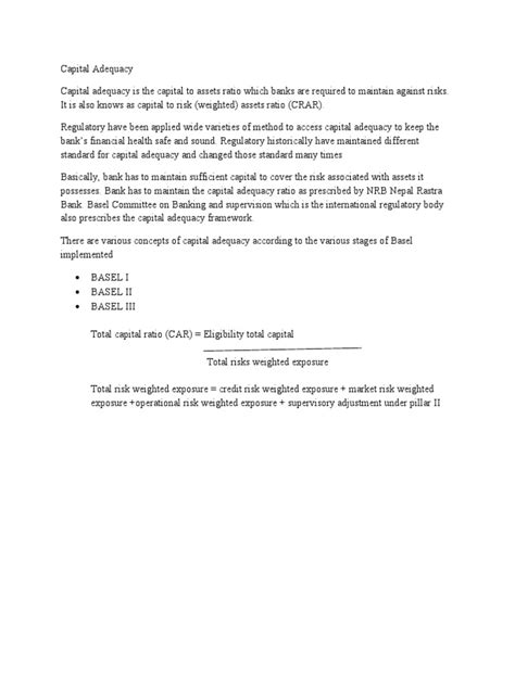 The minimum capital adequacy requirement is a cornerstone of modern financial regulation, guys, and for good reason! Its primary importance lies in promoting financial stability . Imagine a bank that operates with very little capital. If it experiences even a moderate downturn in the economy, or if a few of its major borrowers default, that bank could quickly become insolvent. This insolvency doesn’t just affect the bank itself; it can have ripple effects throughout the entire financial system. Depositors might lose their savings, other banks that have lent money to the failing institution could suffer losses, and confidence in the entire financial sector could erode. This is where the CAR comes in. By mandating that banks hold a certain amount of capital relative to their risk-weighted assets, regulators create a buffer. This buffer allows banks to absorb unexpected losses without collapsing. It acts as a shock absorber, preventing localized problems from escalating into widespread financial crises. Beyond just stability, CAR also plays a crucial role in managing risk . Banks are in the business of taking risks, but they need to do so responsibly. The risk-weighting of assets ensures that banks hold more capital against riskier ventures and less against safer ones. This incentivizes banks to manage their risk exposure prudently. If a bank wants to engage in riskier lending or investment activities, it must set aside more capital, which increases the cost of those activities and encourages more cautious decision-making. It’s a way of aligning the bank’s incentives with the overall goal of a safe and sound financial system. Furthermore, adequate capital requirements can enhance market confidence . When a bank meets or exceeds its CAR, it signals to investors, depositors, and other market participants that the bank is well-capitalized and capable of meeting its obligations. This confidence can lead to lower borrowing costs for the bank, increased investment, and a greater willingness from customers to deposit funds. In essence, a strong CAR is a mark of trustworthiness and financial health, which is vital in a sector that relies heavily on public trust. It’s not just a regulatory checkbox; it’s a fundamental element of a resilient financial ecosystem. The Basel Accords, for instance, have been instrumental in harmonizing these capital requirements globally, aiming to create a level playing field and prevent regulatory arbitrage, where banks might move to jurisdictions with weaker rules. The ongoing evolution of these accords reflects the regulators’ commitment to keeping pace with the ever-changing financial landscape and emerging risks.