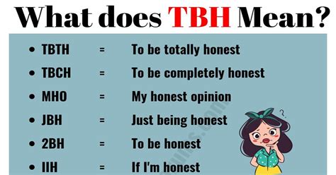 TBH stands for “ to be honest .” It’s a versatile phrase used to preface a statement, often indicating that the speaker is about to share a candid or potentially controversial opinion. Think of it as a verbal heads-up, signaling that what follows is the speaker’s genuine thoughts, unfiltered and straight from the heart. But wait, there’s more to it than just a simple definition. The context in which TBH is used can significantly alter its perceived meaning and impact. For example, using TBH before a compliment can amplify its sincerity, while using it before a critique can soften the blow. It’s all about nuance and understanding the subtle art of online communication. The use of TBH is incredibly diverse, popping up everywhere from casual texts between friends to more formal online discussions. Recognizing its function as a truth-telling preface can really help you navigate the complexities of digital dialogue. Furthermore, it allows you to fine-tune your own responses, ensuring that you’re not just understood, but also perceived in the manner you intend. So, the next time you see TBH, remember it’s your cue to pay a little extra attention – honesty is about to take center stage!