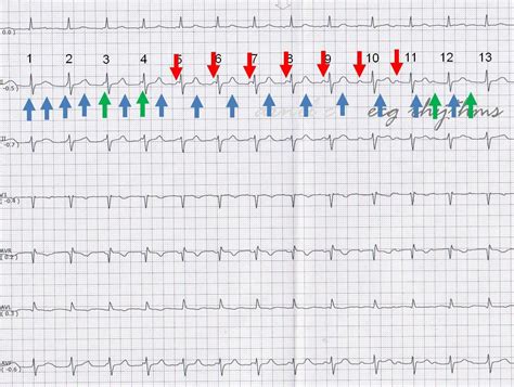 The Wenckebach block ECG is characterized by a progressive prolongation of the PR interval on the electrocardiogram until a beat is dropped. The PR interval represents the time it takes for the electrical impulse to travel from the atria to the ventricles. In Wenckebach block, this interval gradually increases with each successive beat until the AV node completely blocks an impulse, resulting in a missing QRS complex. After the dropped beat, the PR interval resets and the cycle begins again. This repeating pattern of progressive PR interval lengthening followed by a dropped beat is the hallmark of Wenckebach block, making it a relatively easy rhythm to identify once you know what to look for. It’s also important to note that the R-R interval (the time between ventricular beats) shortens slightly before the dropped beat, creating a grouped beating pattern. Understanding these key characteristics is crucial for accurate diagnosis and appropriate management of this type of heart block. Wenckebach block can occur due to various reasons, including increased vagal tone, certain medications, or underlying heart conditions, highlighting the importance of thorough clinical evaluation to determine the underlying cause and guide treatment decisions. Recognizing Wenckebach block on an ECG is a fundamental skill for healthcare professionals, as it enables timely intervention to prevent potential complications associated with this arrhythmia. By familiarizing themselves with the distinctive ECG features of Wenckebach block, clinicians can confidently identify and manage this condition, ultimately improving patient outcomes. Overall, Wenckebach block represents a fascinating and clinically significant cardiac arrhythmia that warrants careful attention and understanding. Its unique ECG pattern provides valuable insights into the underlying electrical conduction abnormalities within the heart, allowing for targeted diagnostic and therapeutic interventions. With a comprehensive grasp of Wenckebach block, healthcare providers can deliver optimal care to patients affected by this condition.