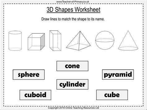 • Printable Worksheets : Look for printable worksheets that provide practice in identifying, drawing, and labeling 3D shapes. These can be used for extra practice or as homework.